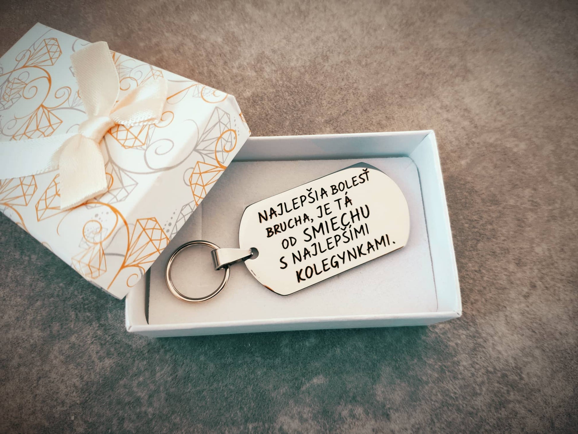 Elegantný nerezový prívesok na kľúče s možnosťou osobného gravírovania. Tento štýlový doplnok je vyrobený z chirurgickej ocele a dodáva sa v luxusnej darčekovej krabičke. S rozmermi 50x27x2mm. Je ideálnym spoločníkom pre každodenné použitie alebo ako výnimočný dar pre vašich blízkych. Okrem štandardného gravírovania ponúkame aj možnosť vlastného loga. Osobnosť do každého detailu. Buďte originálni so štýlovým príveskom na kľúče z našej ponuky.